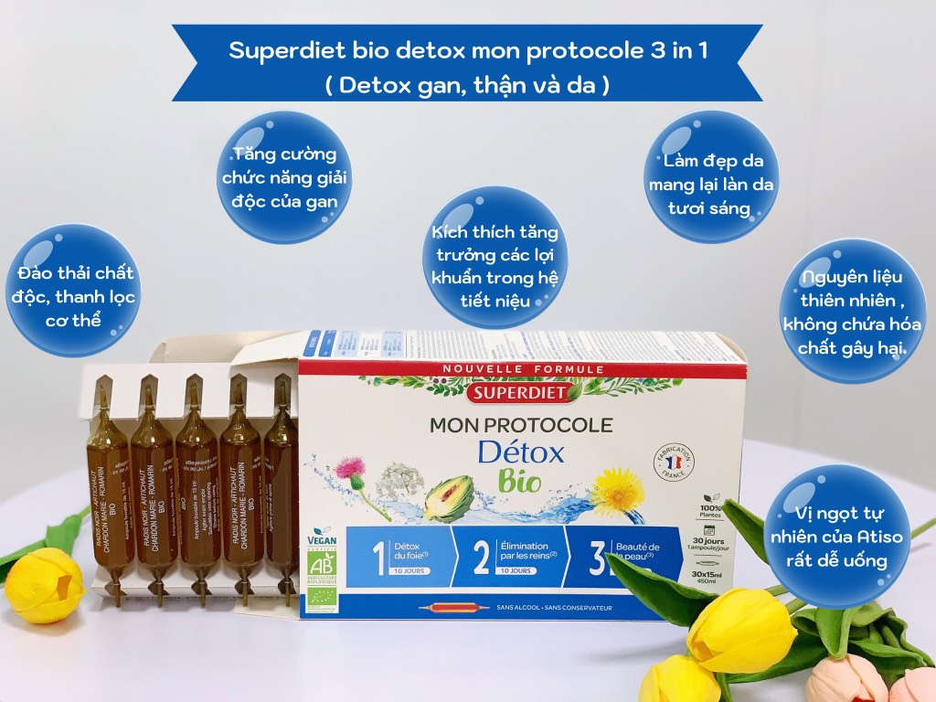 Detox Gan Thận Da Superdiet Protocole Detox Bio Thải độc 3 chức năng Superdiet của Pháp được chiết xuất từ 15 loại cây canh tác bằng công nghệ hữu cơ của Pháp