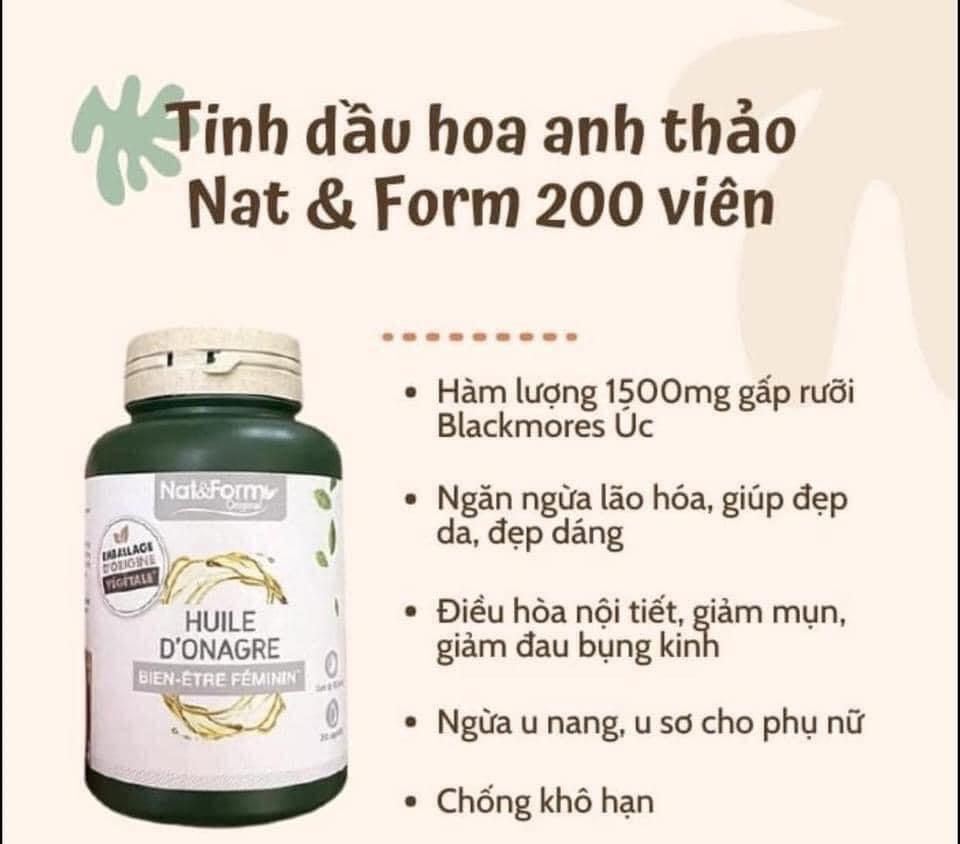 Tinh dầu hoa anh thảo Nat&Form Huile D’Onagre dạng Viên nang chứa hàm lượng hoa anh thảo và vitamin E giúp cân bằng nội tiết tố nữ, điều hòa kinh nguyệt, hỗ trợ sinh lý, đồng thời làm đẹp da, giữ ẩm và ngăn ngừa lão hóa.Cung cấp nguồn acid béo có lợi cho sức khỏe.