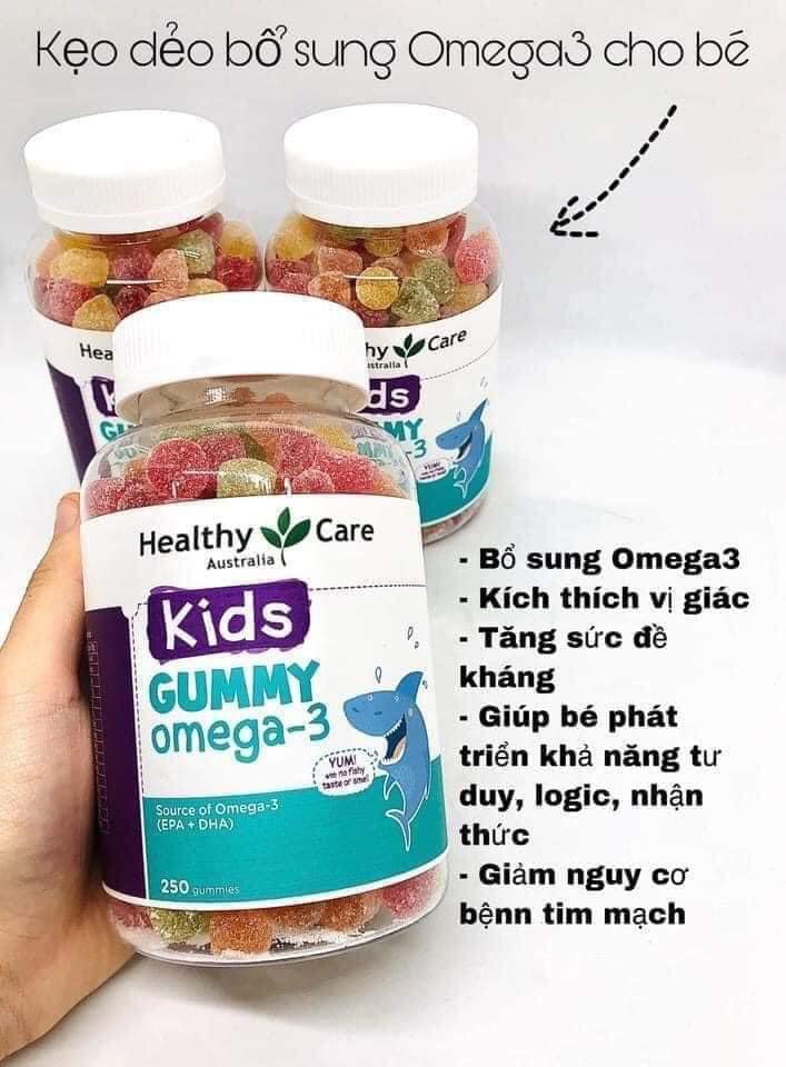 HealthyCare Kids Gummy Omega 3 là sản phẩm dành cho bé từ trên 2 tuổi (đã biết nhai), bổ sung hàm lượng acid béo omega-3 từ dầu cá vô cùng an toàn. Đặc biệt, viên nhai có hương vị trái cây ngon, không tanh mùi cá, dễ dàng cho bé sử dụng. Sản phẩm của Healthy Care đạt chuẩn GMP, an toàn không phụ gia độc hại.